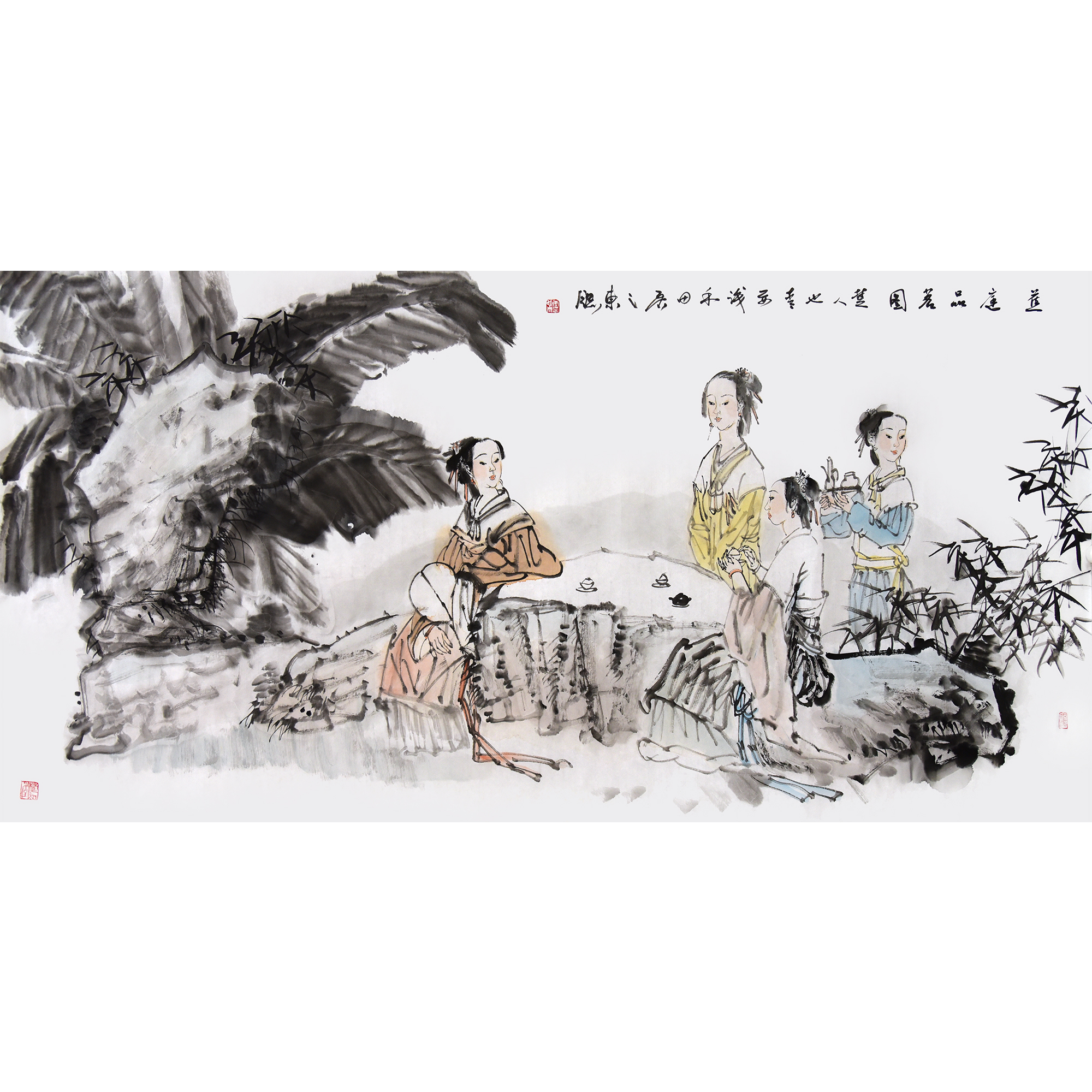 中国美术家协会会员·湖北师范大学教授 李也青 《蕉庭品茗图》人物 8.5平尺;李也青,1961年生于湖北荆州。现为中国美术家协会会员;民促会会员;中国壁画学会会员;湖北师范大学教授、硕士研究生导师;湖北省高校教师系列职称评委。历任湖北师范大学美术学院院长、中国艺术研究院冯远工作室助理、清华大学中国画高研班主讲导师。作品多次参加中国美协等主办的各类大展或获奖,出版教材发表论文十余万字,出版画集多种。应邀赴国内外进行学术交流和讲学并举办个人画展和联展。