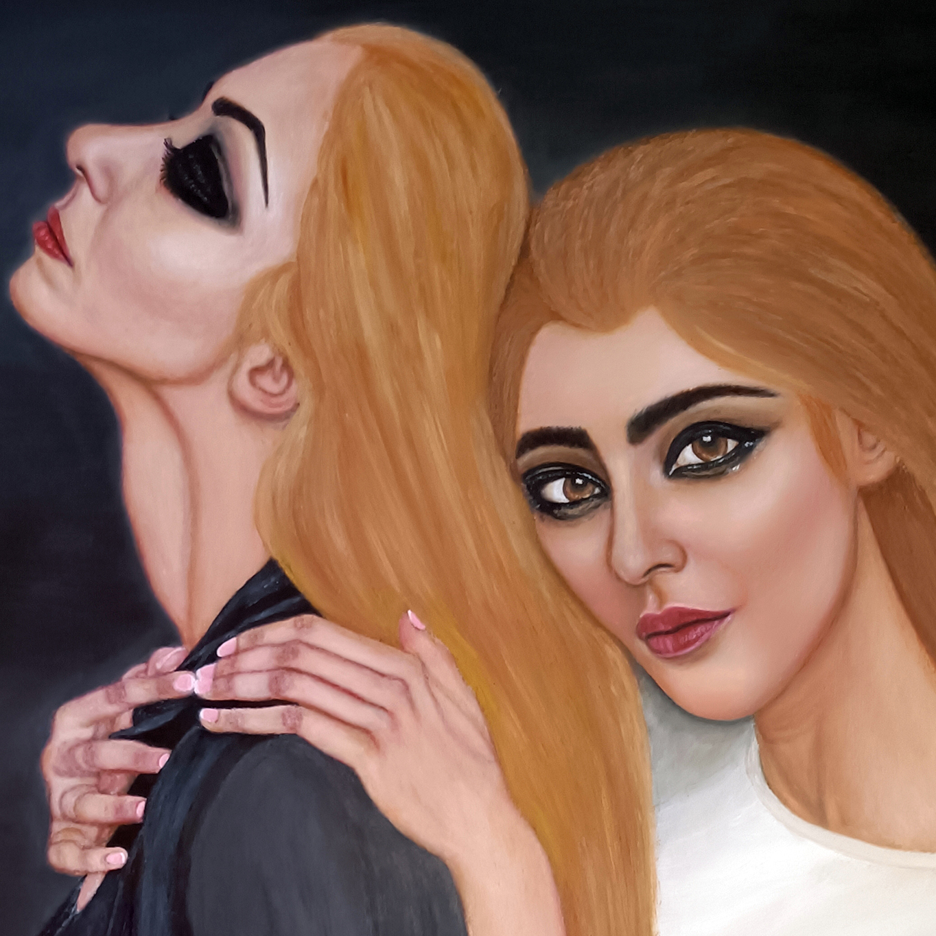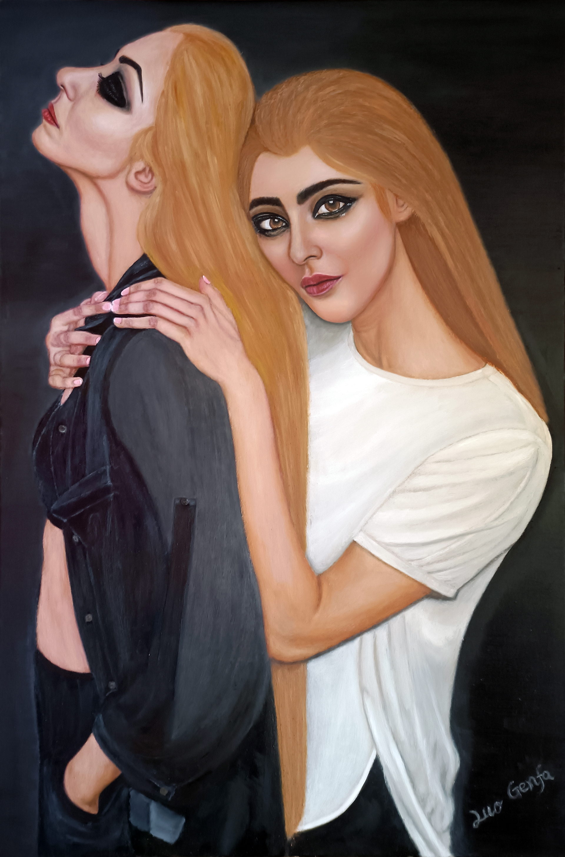 致敬八卦,黑阴白阳相互依存,阳极生阴,阴极生阳,二者互为其根,生生不息。黑白的颜色,乃乾坤初定、人文初始之色,亦宇宙“原色”,是中国最经典的色彩,富含了智慧,是大千世界的起点,那就怪不得太极八卦图,摒弃了万紫千红,只留下黑白两色了。 黑白双娇应该是母女吧!我追求人物肖像写实油画要展现出“血、肉、灵魂”,要画出“质感”。我画写实油画,一般总是老老实实用最原始的传统方法,按照欧洲古典油画技法,先素描、打底色、上N次油画色,最后细节化、色彩化上N次油画色完成。当然,绘画创作过程中会遇到挑战,有时会采用自己在绘画实践中独特的技法去解决。