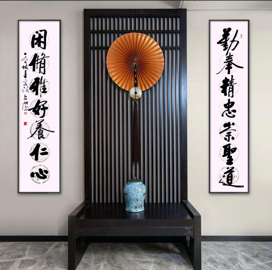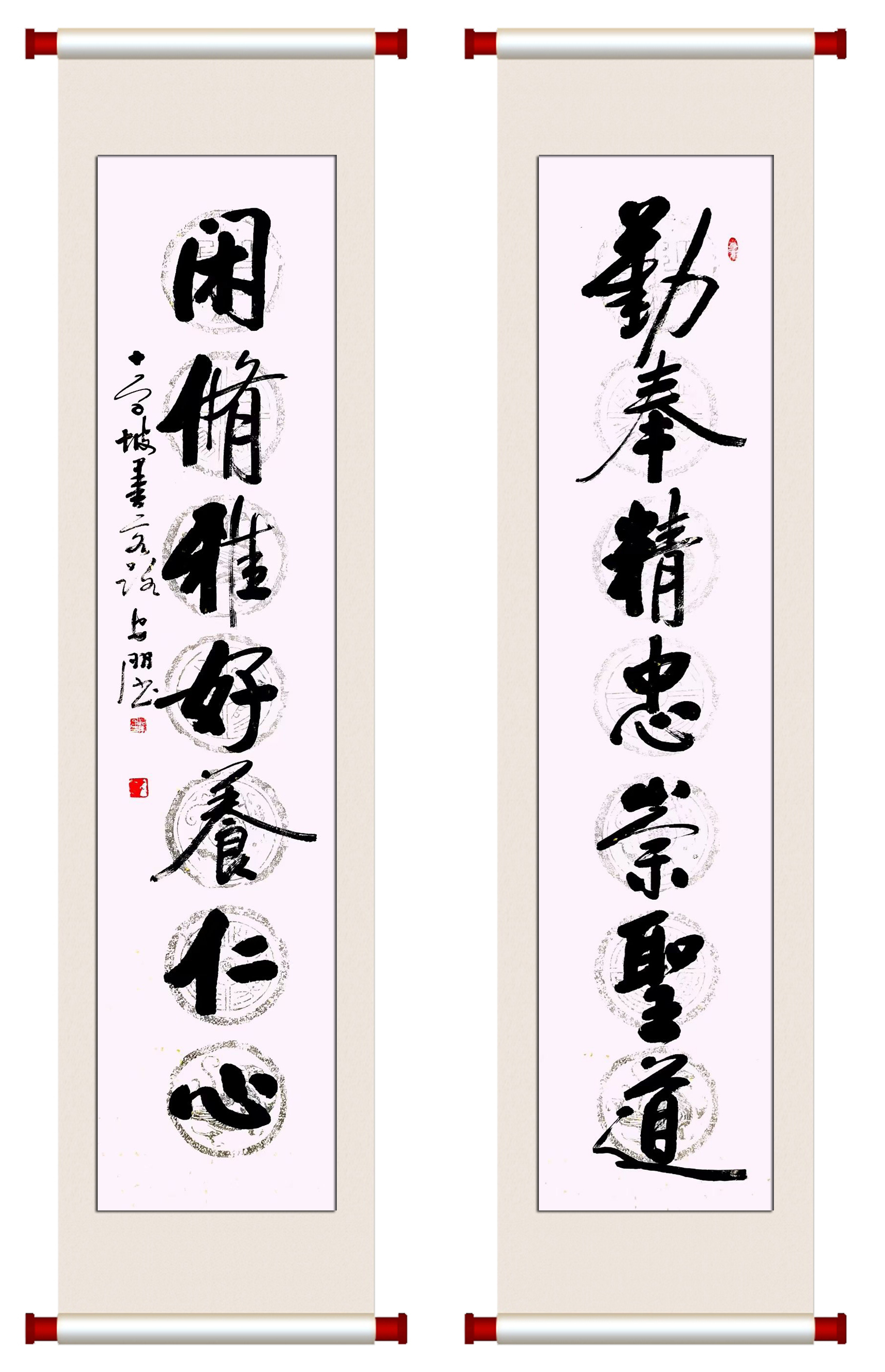 行书对联《勤奉精忠崇圣道,闲修雅好养仁心》138x34cmx2