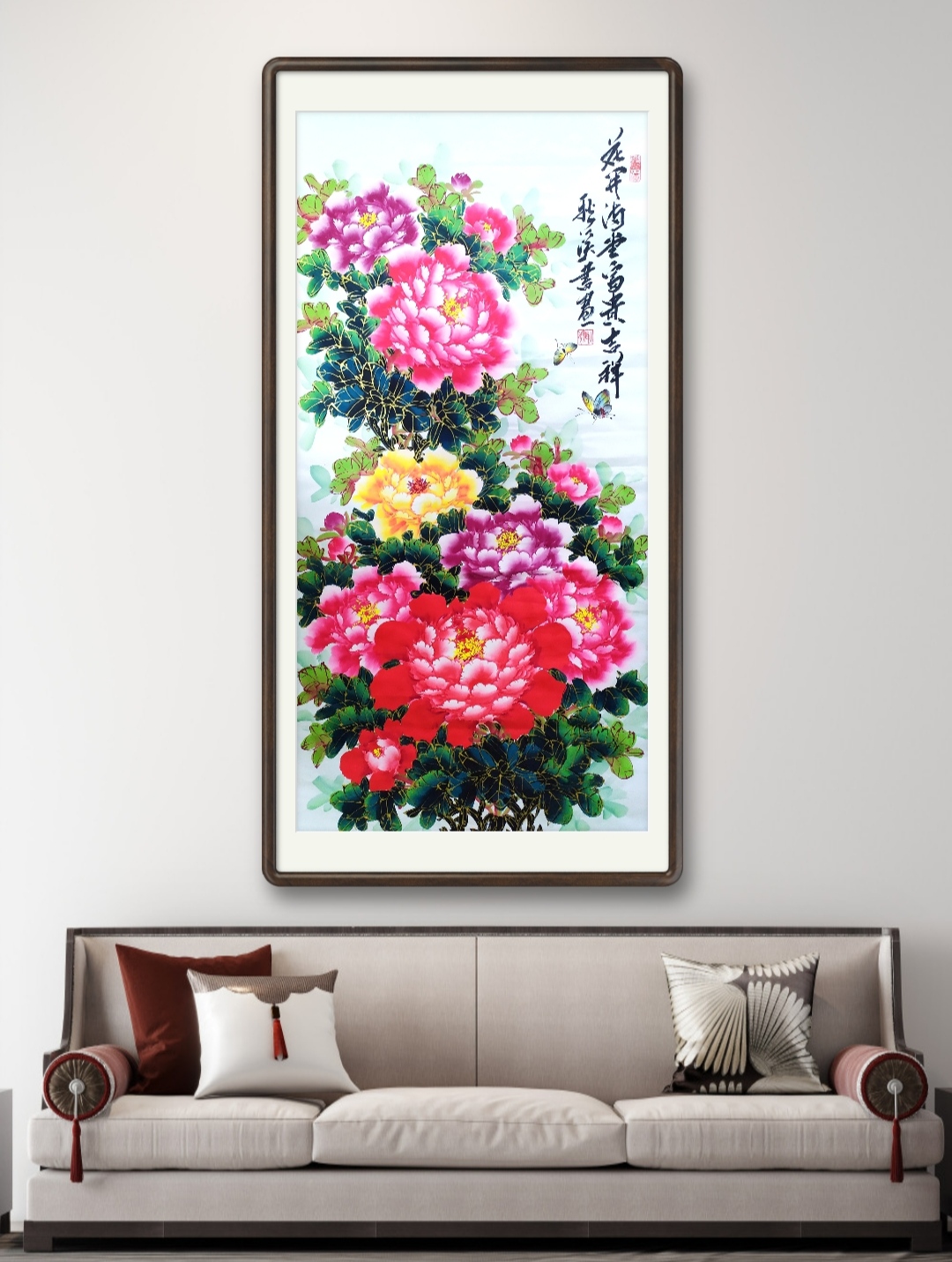 2023年作品,国画牡丹《花开满堂富贵吉祥》138x68cm+书法《和》大字138x68cm