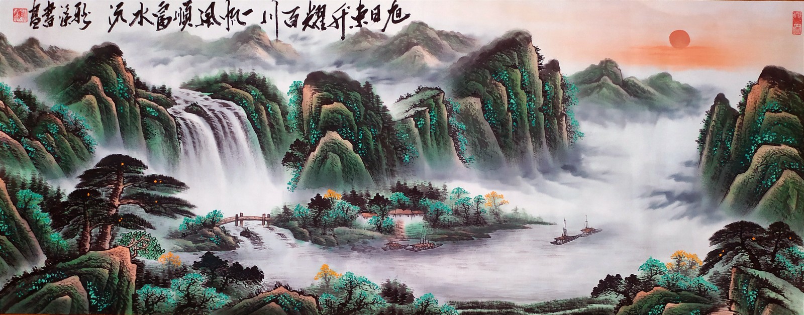 2023年作品,国画-旭日东升耀百川,一帆风顺富水流180x70cm