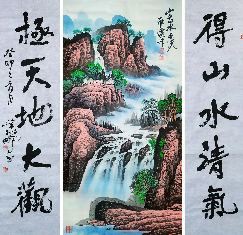 2023年作品,国画138x68cm《山高水长流》+书法138x68cm《得山水清气,极天地大观》