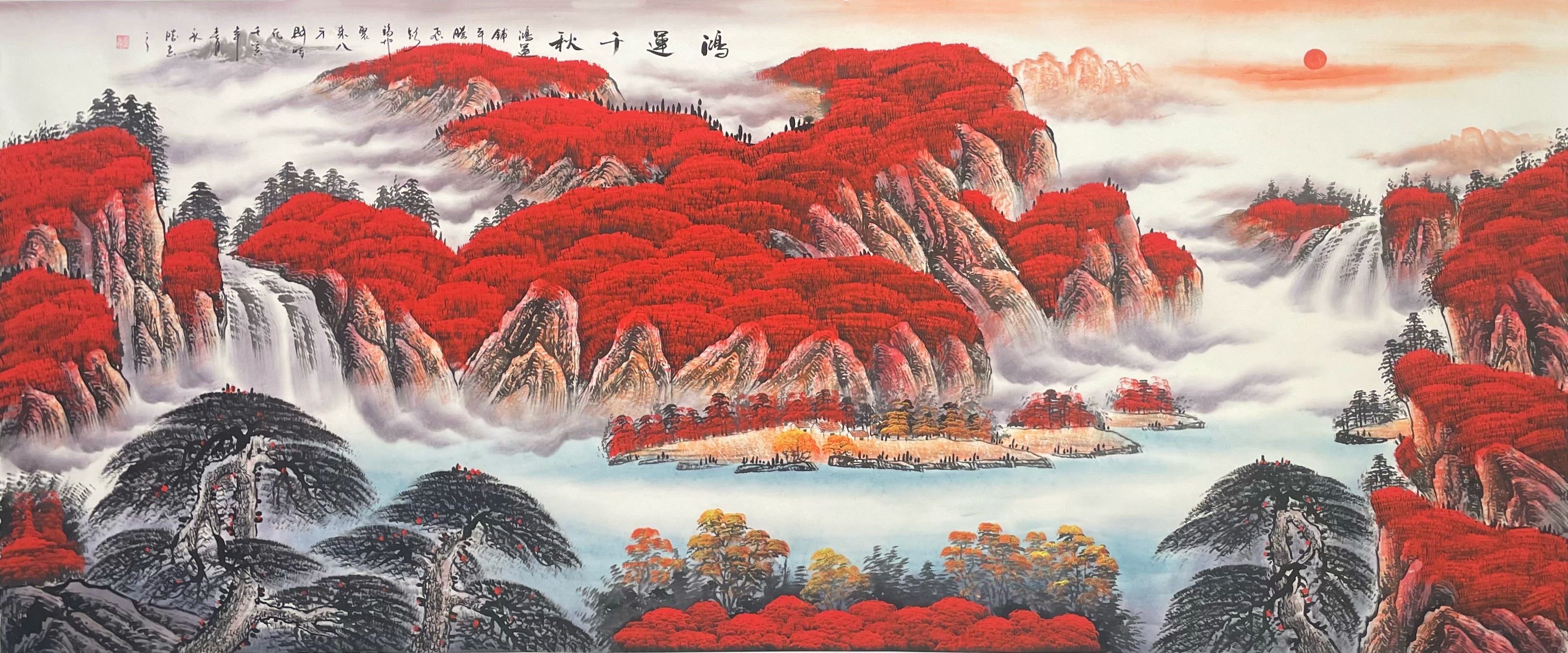 卢永胜《鸿运当头》系列是其代表作品,其作品画面广阔,气吞山河,可谓包罗万象:山川、湖盆、瀑布、红叶、云雾、松树、屋舍等等,一派大好河山、和谐安宁之感,寓意国泰民安、家兴业旺。并且其作品布局巧妙,安排合理,画面藏风聚气。瀑布汇入元宝形湖水之中,屋舍置于“元宝”中间,寓意财源广进;财富盈门;雨雾蒸腾,霞光映照寓意紫气东来;松柏挺拔寓意长寿吉祥;山峦重叠寓意平步青云等等。在纵横挥洒之间,画家祝福祖国强大,祝福人民富裕健康的正能量精神跃然纸上。他的作品,既有着深厚的传统积淀,又有着鲜明的时代气息,雄浑博大、气势恢宏,博得了画界同仁和众多书画爱好者的青睐。