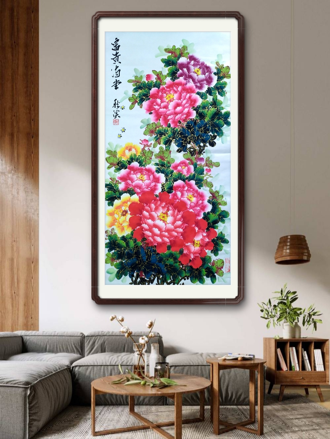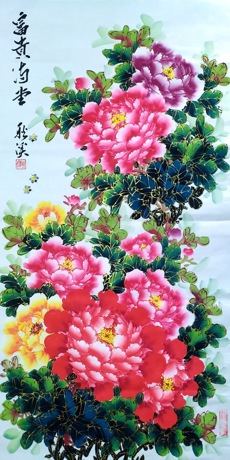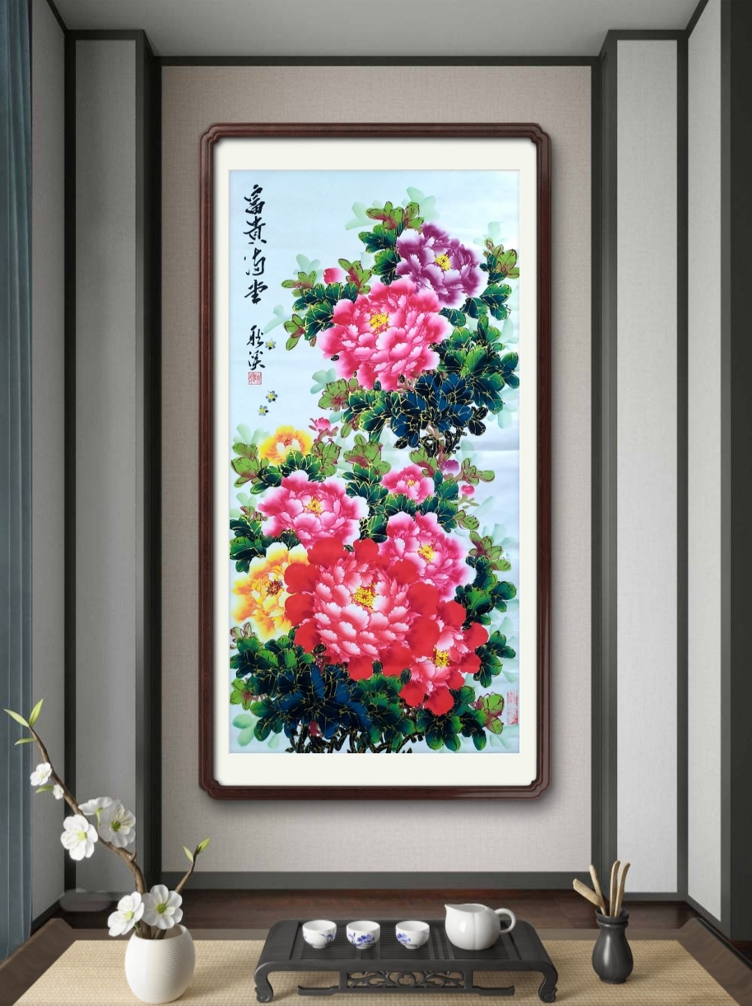 2023年作品,国画牡丹《富贵满堂》138x68cm +赠送书法《茶道》120x60cm