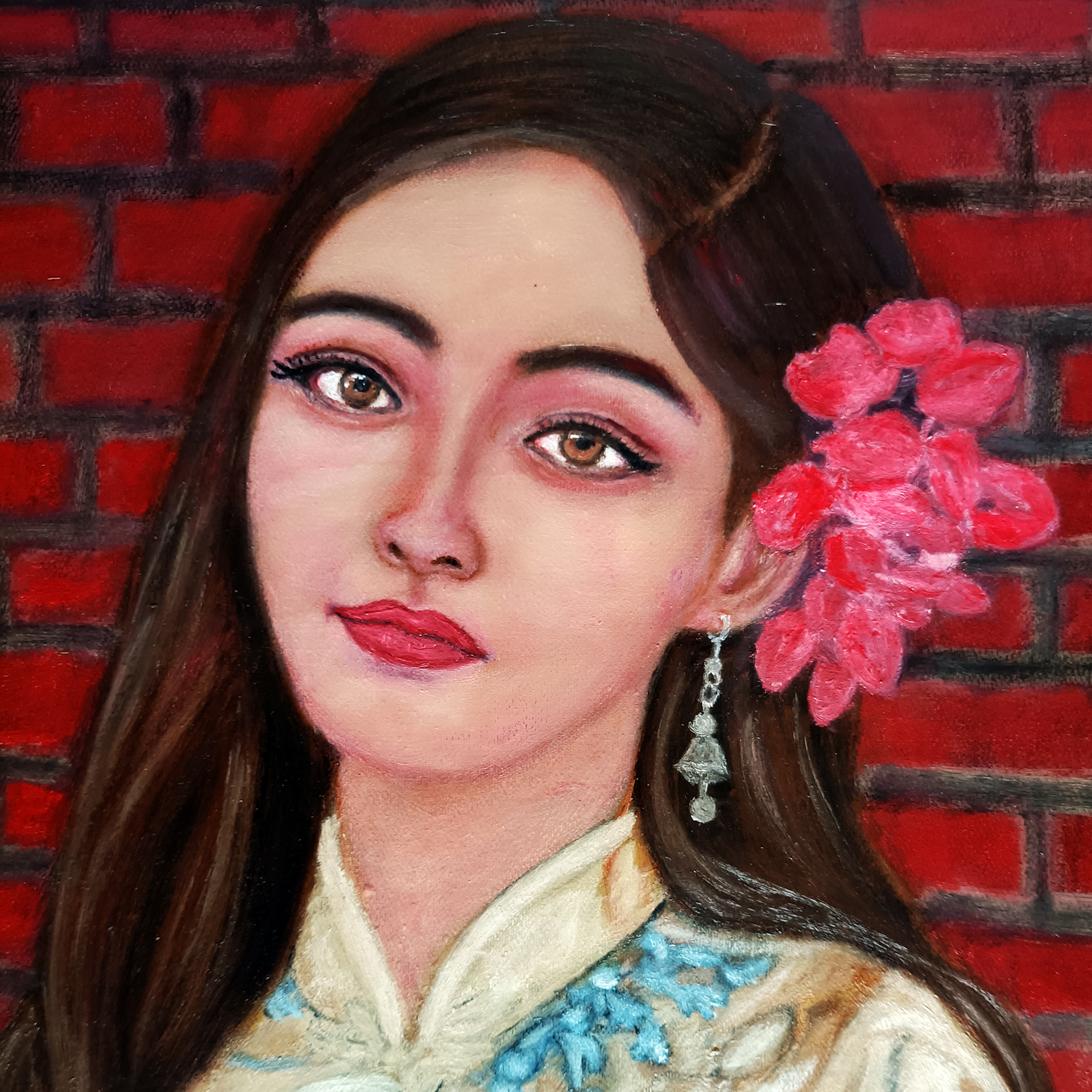 我追求人物肖像写实油画要展现出“血、肉、灵魂”,要画出“质感”。我画写实油画,一般总是老老实实用最原始的传统方法,按照欧洲古典油画技法,先素描、打底色、上N次油画色,最后细节化、色彩化上N次油画色完成。当然,绘画创作过程中会遇到挑战,有时会采用自己在绘画实践中独特的技法去解决。