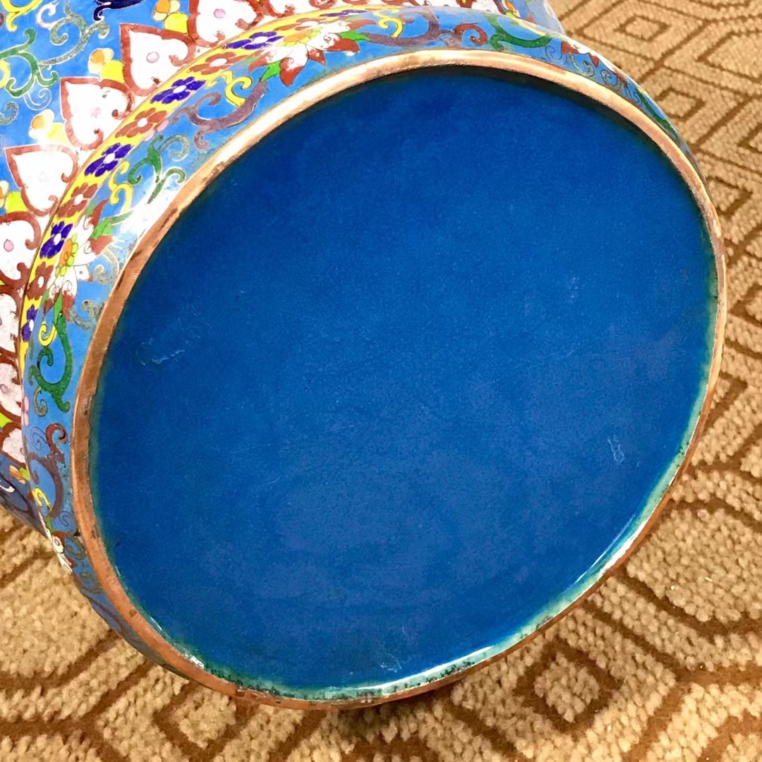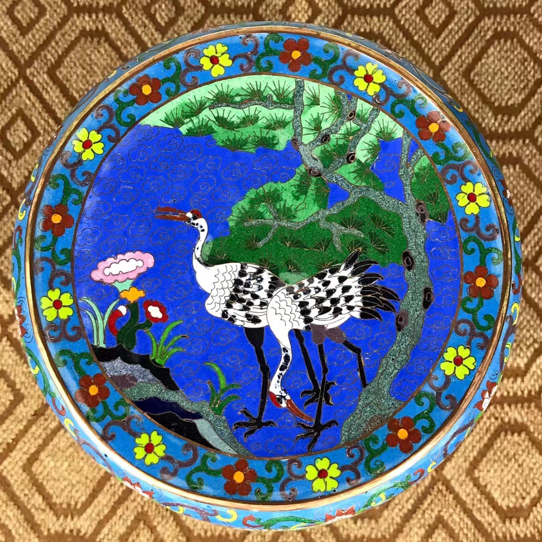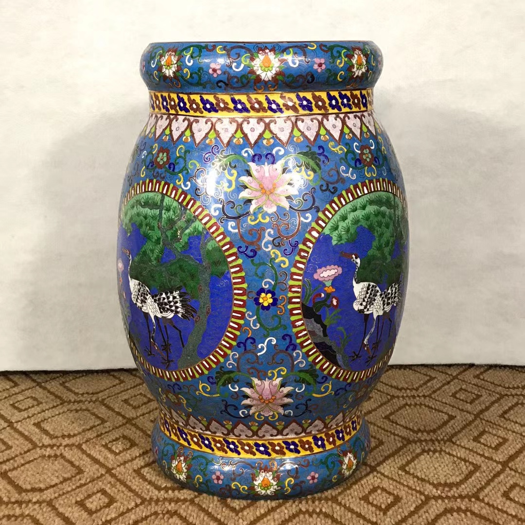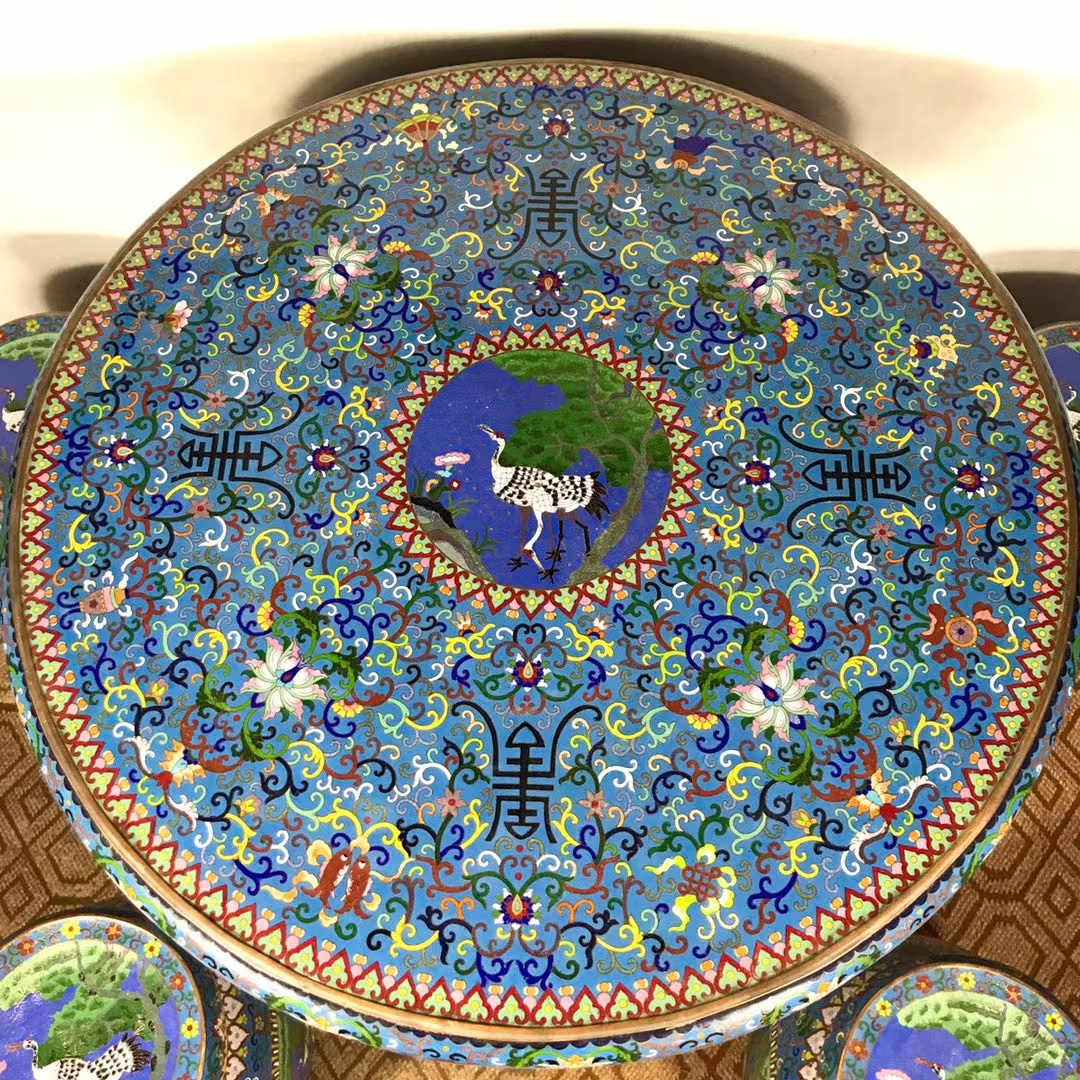 景泰蓝松鹤图圆桌一套,紫铜材质,纯手工打造,器型漂亮,做工精细,通体满工艺,纹饰饱满、精美,仙鹤形态逼真,寓意吉祥!