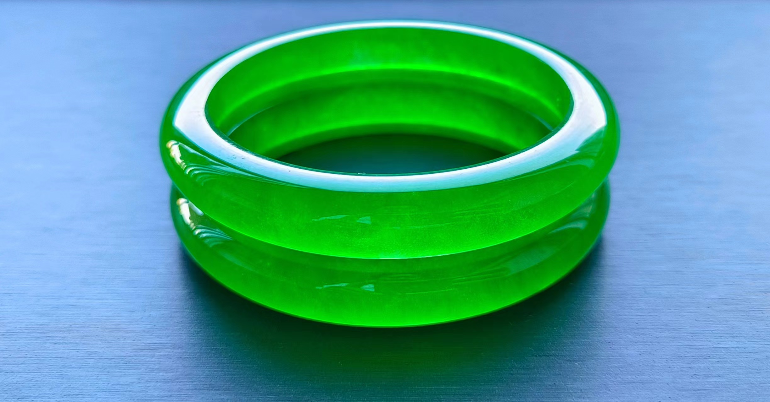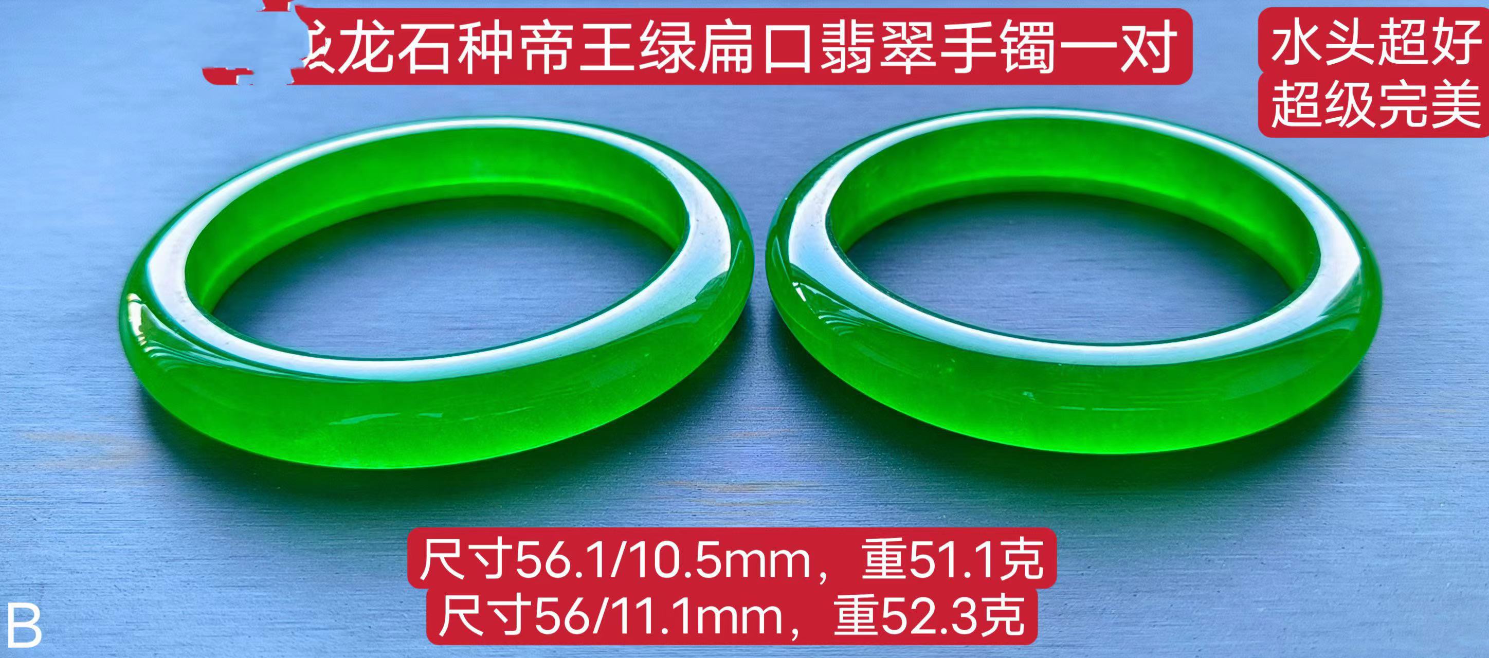 龙石种帝王绿扁口翡翠手镯一对,水头超好,超级完美,重51.1/52.3克,口径56