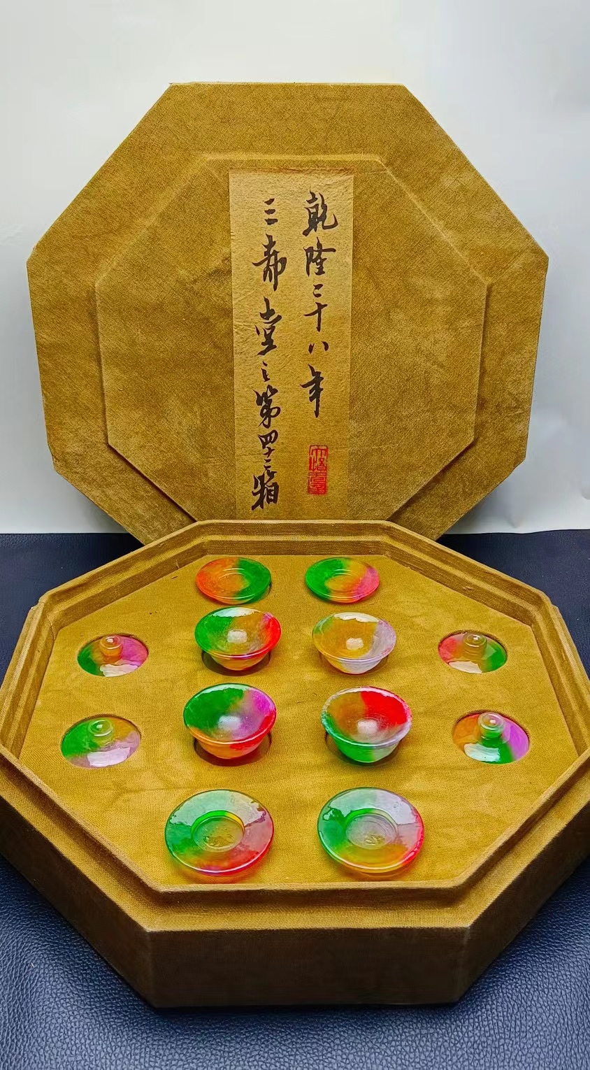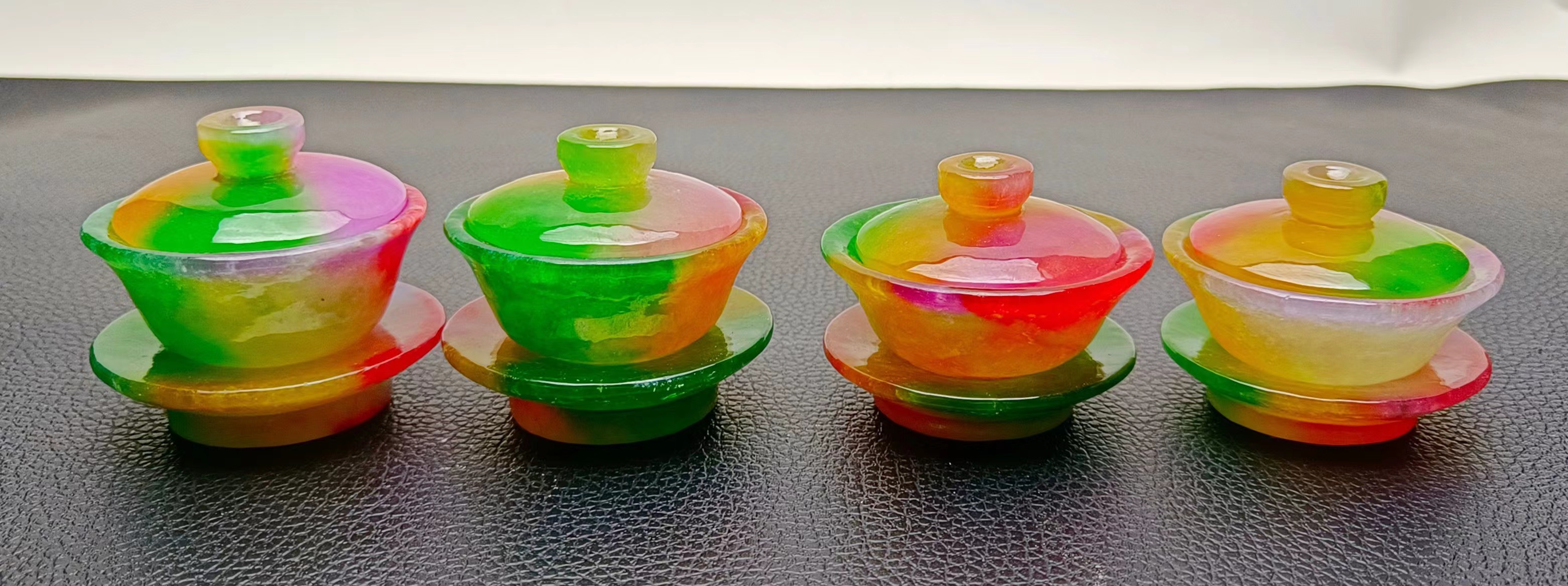 珍藏款龙石种多彩翡翠盖碗一盒,水头超好,超级完美,重605克